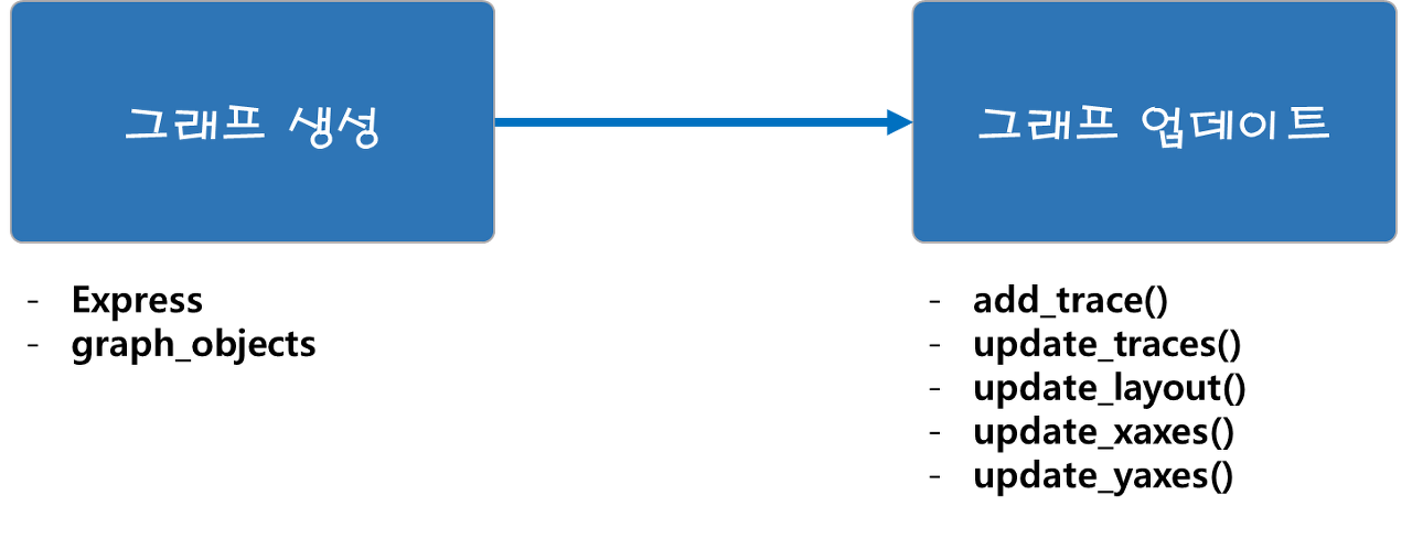 Plotly에서 그래프를 그리는 가장 보편적인 방법은 ① 기초 그래프를 생성 후 ② 다양한 방법으로 그래프를 업데이트 하는 2단계를 거치는 방법이다. 2장에서는 기초그래프 생성에 대한 내용을 다뤄보았다. [Python plotly 시각화] 2. Graph Object 와 Plotly Express 이번 3장에서는 그래프 업데이트에 대한 5가지 함수 기능에 대해 알아보자. Plotly의 기본 문법과 여러 그래프들은 이 5개 함수를 활용한 Plotly 그래프의 튜닝과정이다. 1. add_trace( ) 2. update_trace( ) 3. update_layout( ) 4. update_xaxes( ) / update_yaxes( ) 공식 홈페이지 : https://plotly.com/python-api-..
